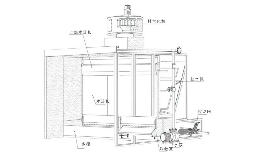環(huán)保型水幕柜主要是由自吸水泵循環(huán)抽水往水簾板上均勻的流下來,使噴槍噴出來的漆霧和打磨產(chǎn)生的大顆粒粉塵被水簾板上的水打到下面水池里。再有少部分細(xì)微的漆霧和粉塵顆粒被末端的風(fēng)機(jī)引入高效過濾器,通過排風(fēng)管道排出車間外面或進(jìn)行高空排放。